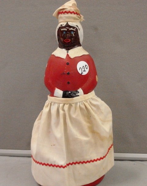 Aunt Jemima Bottle Shape , It Was Aunt Jemima With A Broom In One Hand And A Pencil In The Other With A Notepad On Her Stomach.